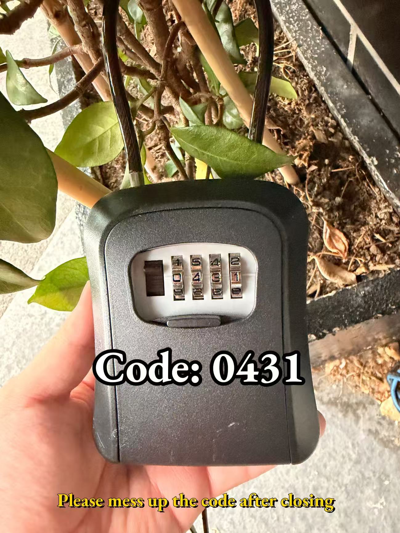 After retrieving the key, please turn the numbers on the lockbox to a random position to lock it properly.