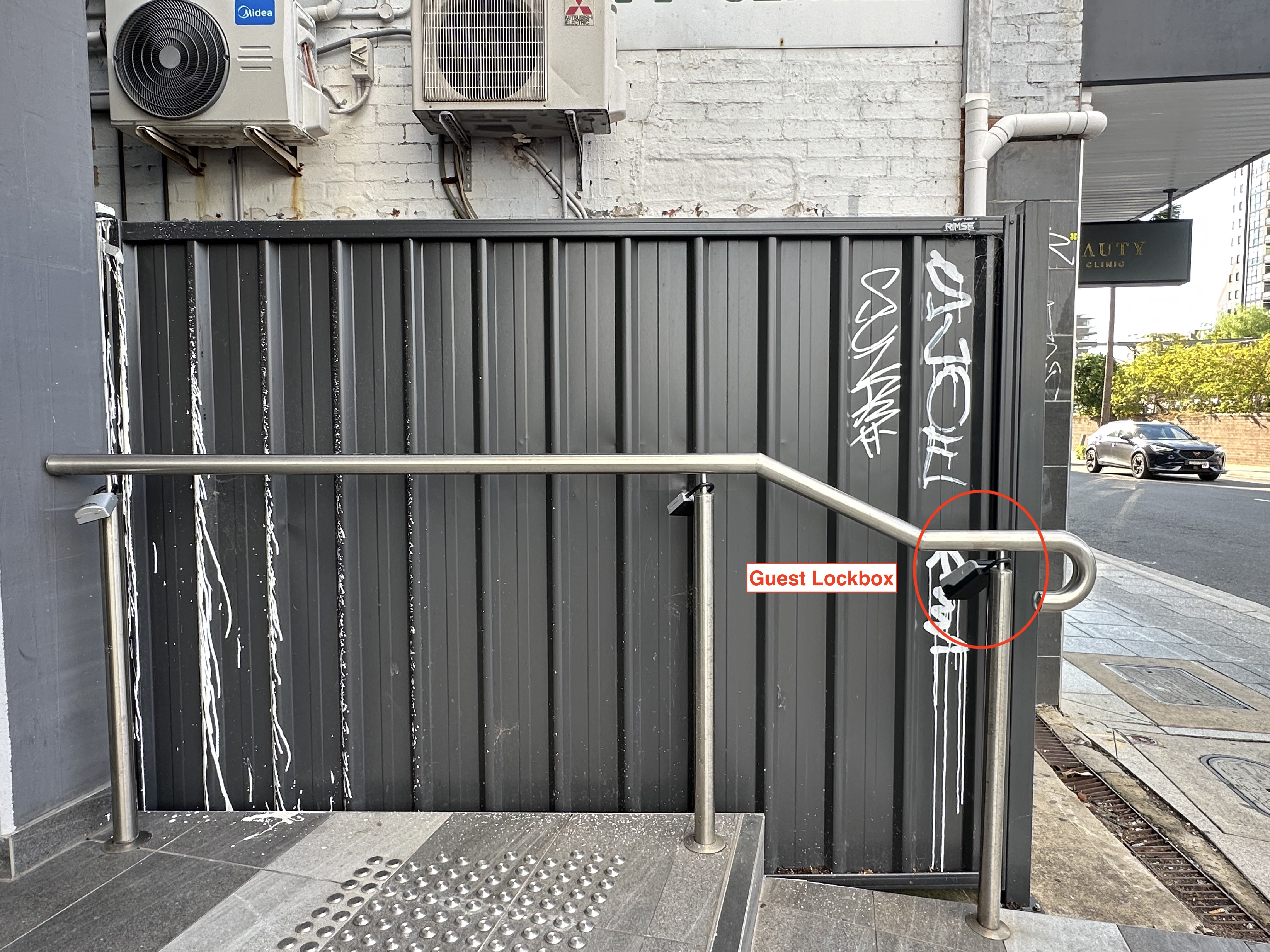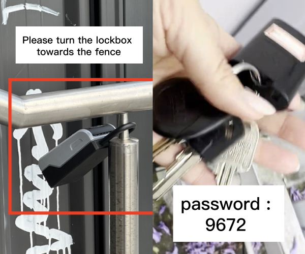 You’ll find a lockbox attached to the railing near the building entrance.