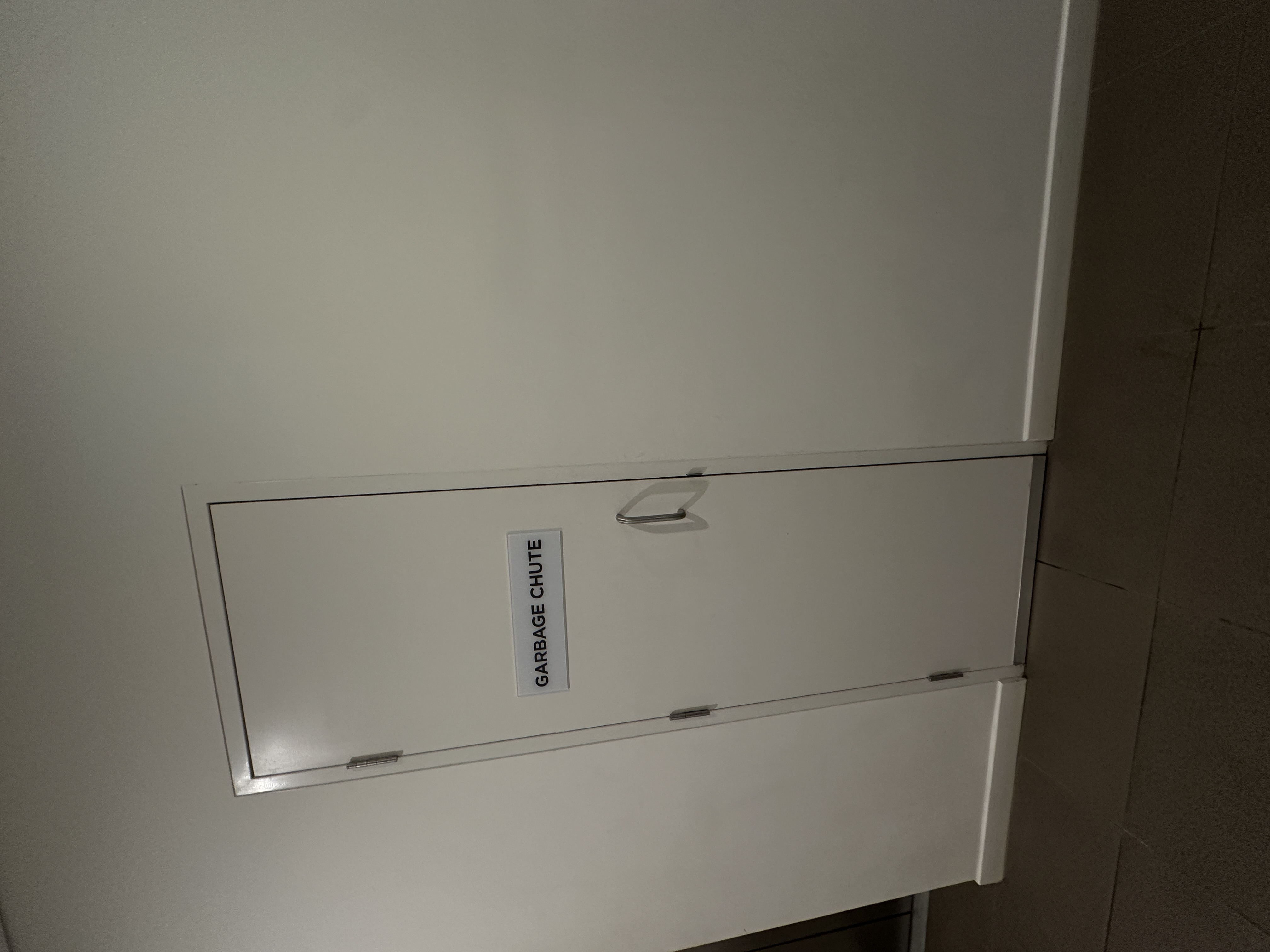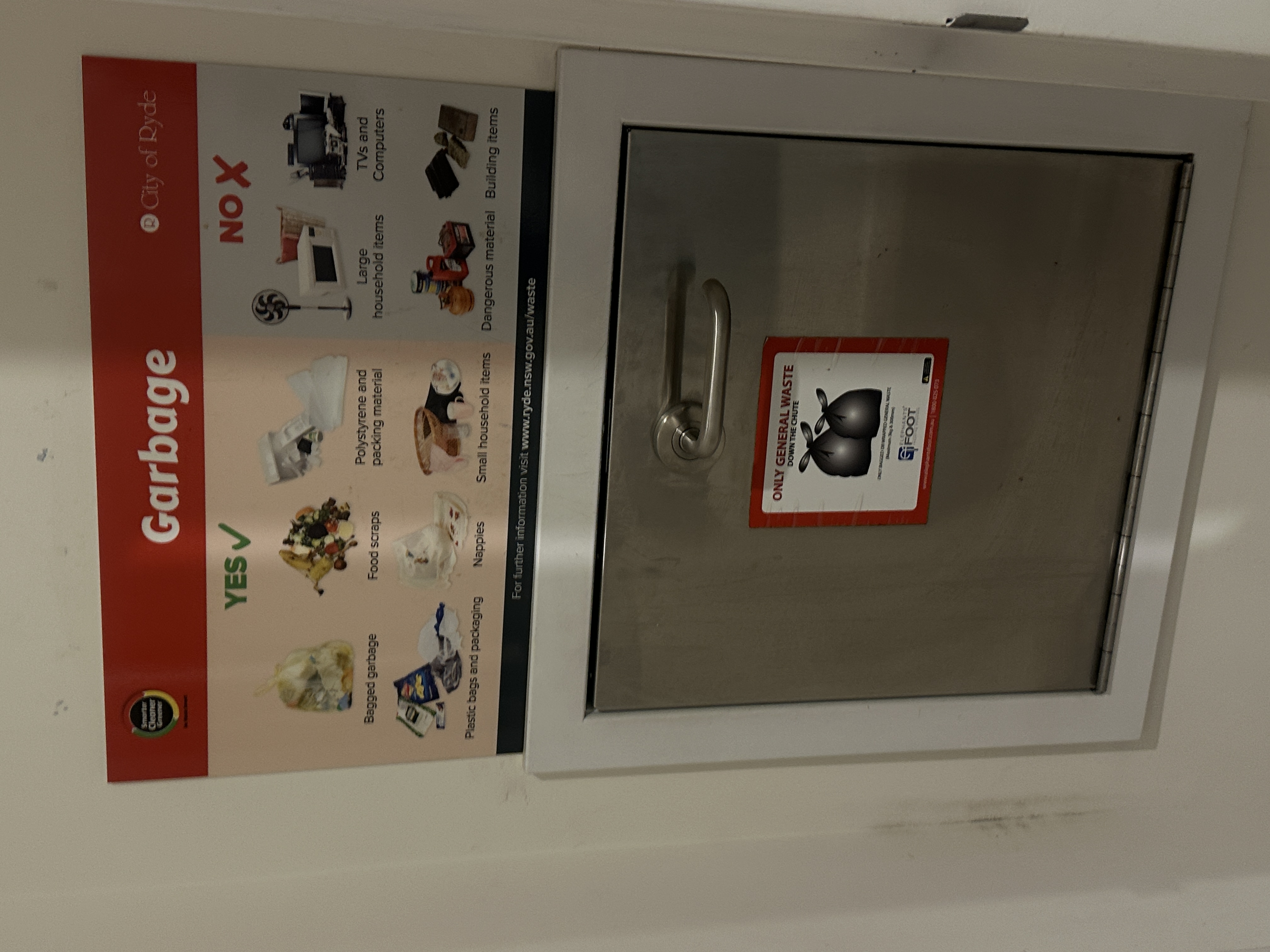 The chute doors are clearly marked for easy identification. Please ensure you take all rubbish out before check-out to avoid additional cleaning charges.