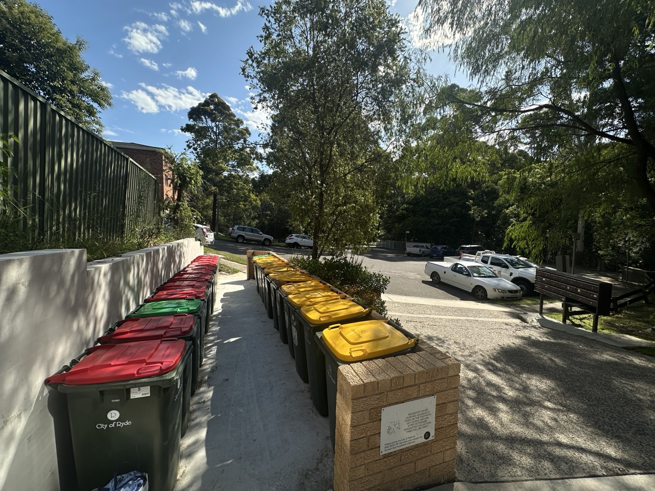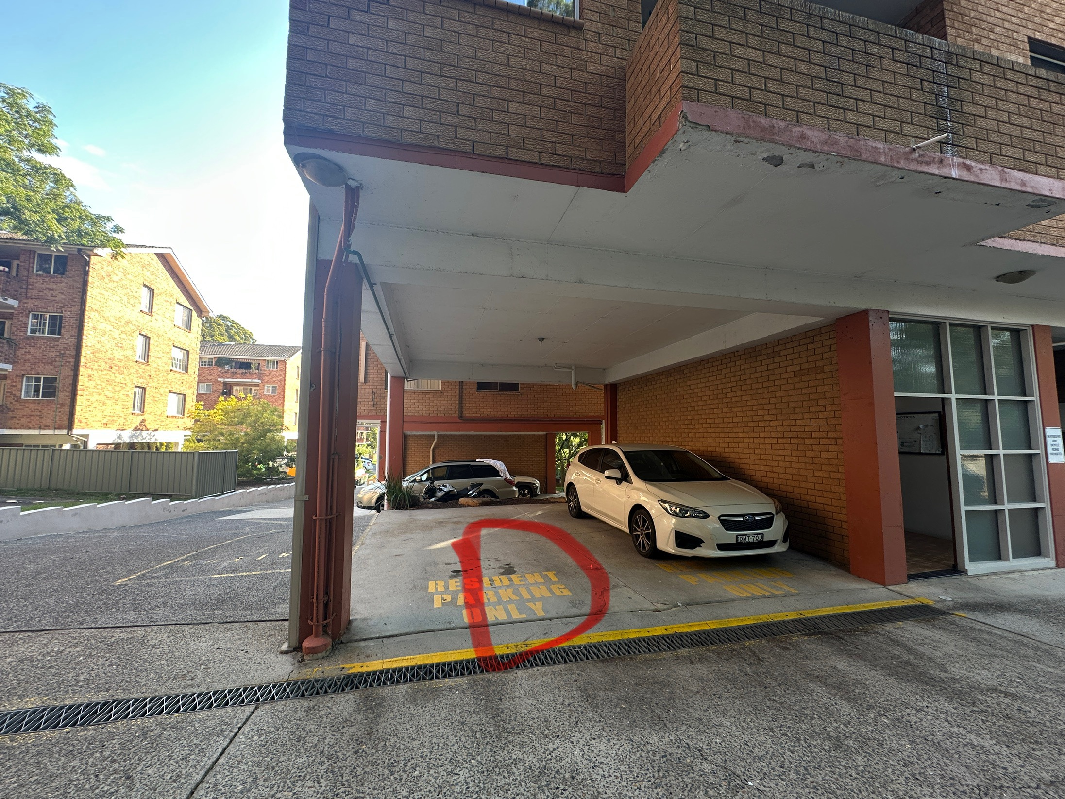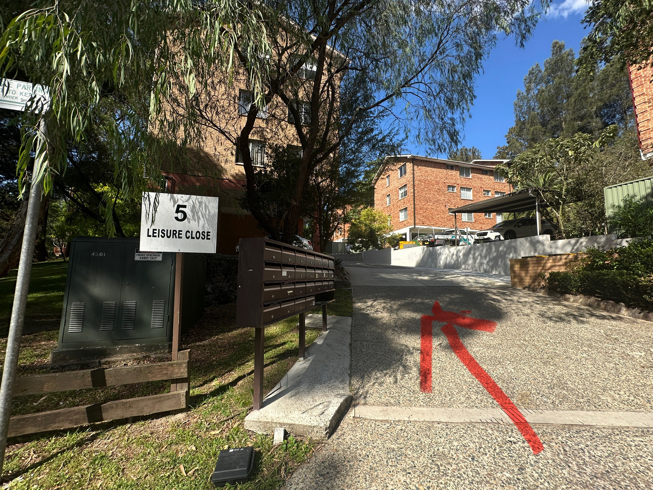 The rubbish area is located outside the building, near the parking area, opposite the mailboxes.
